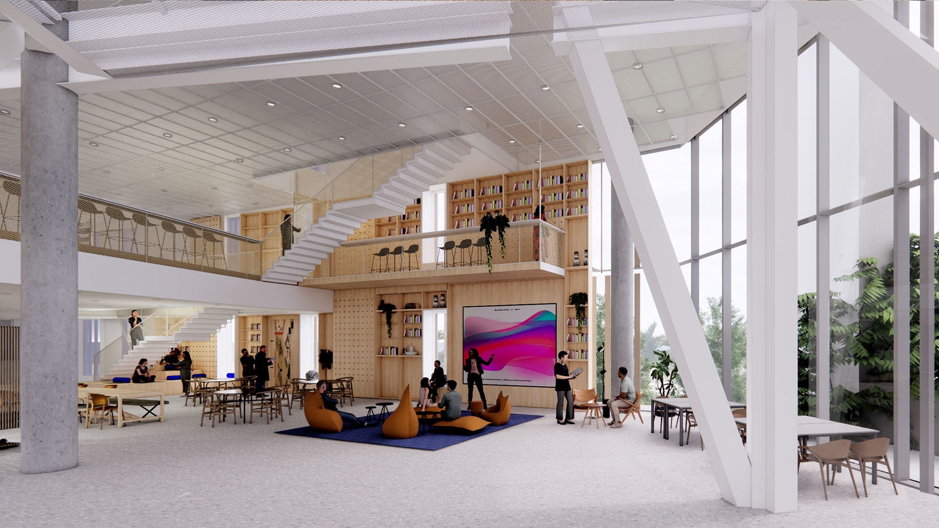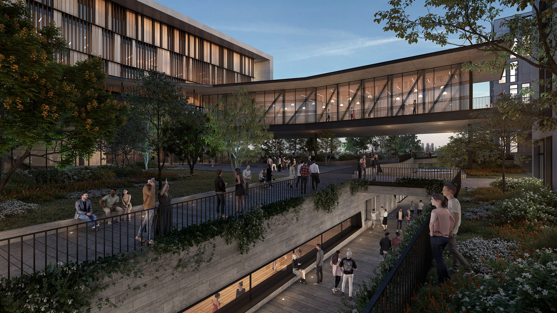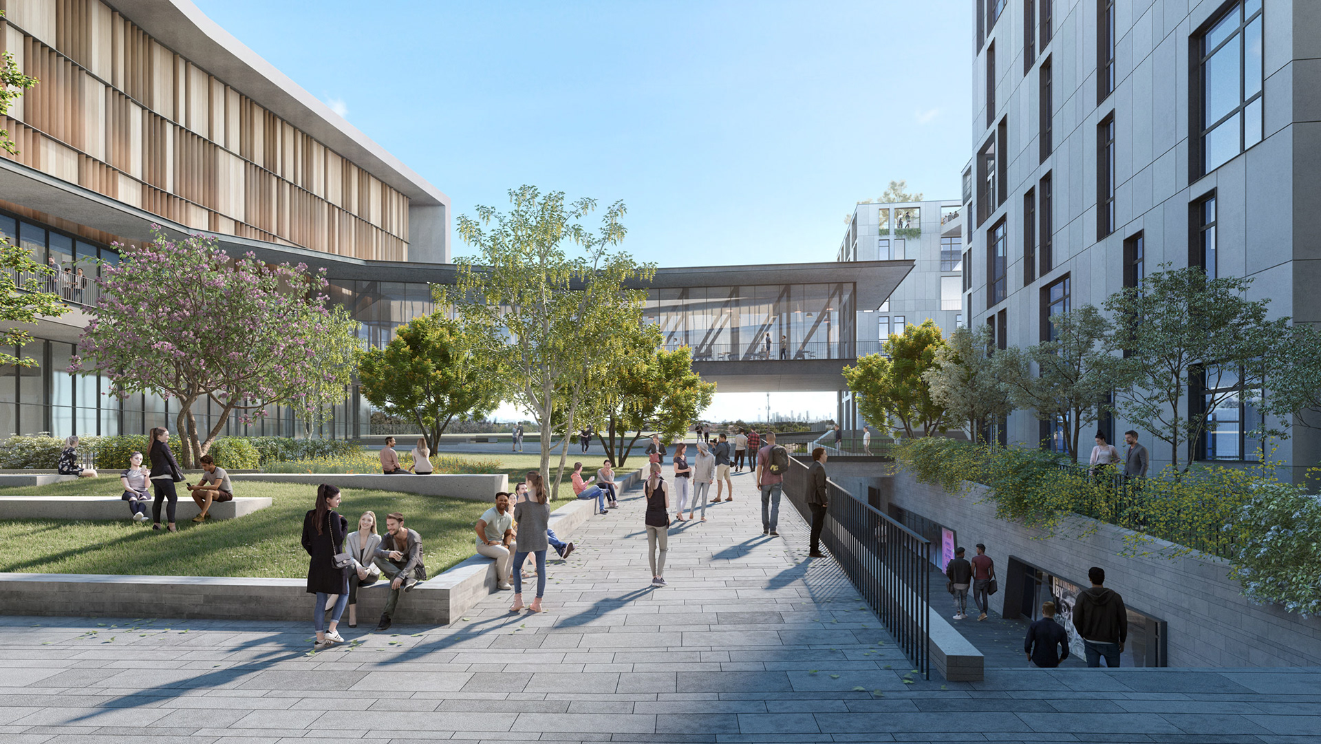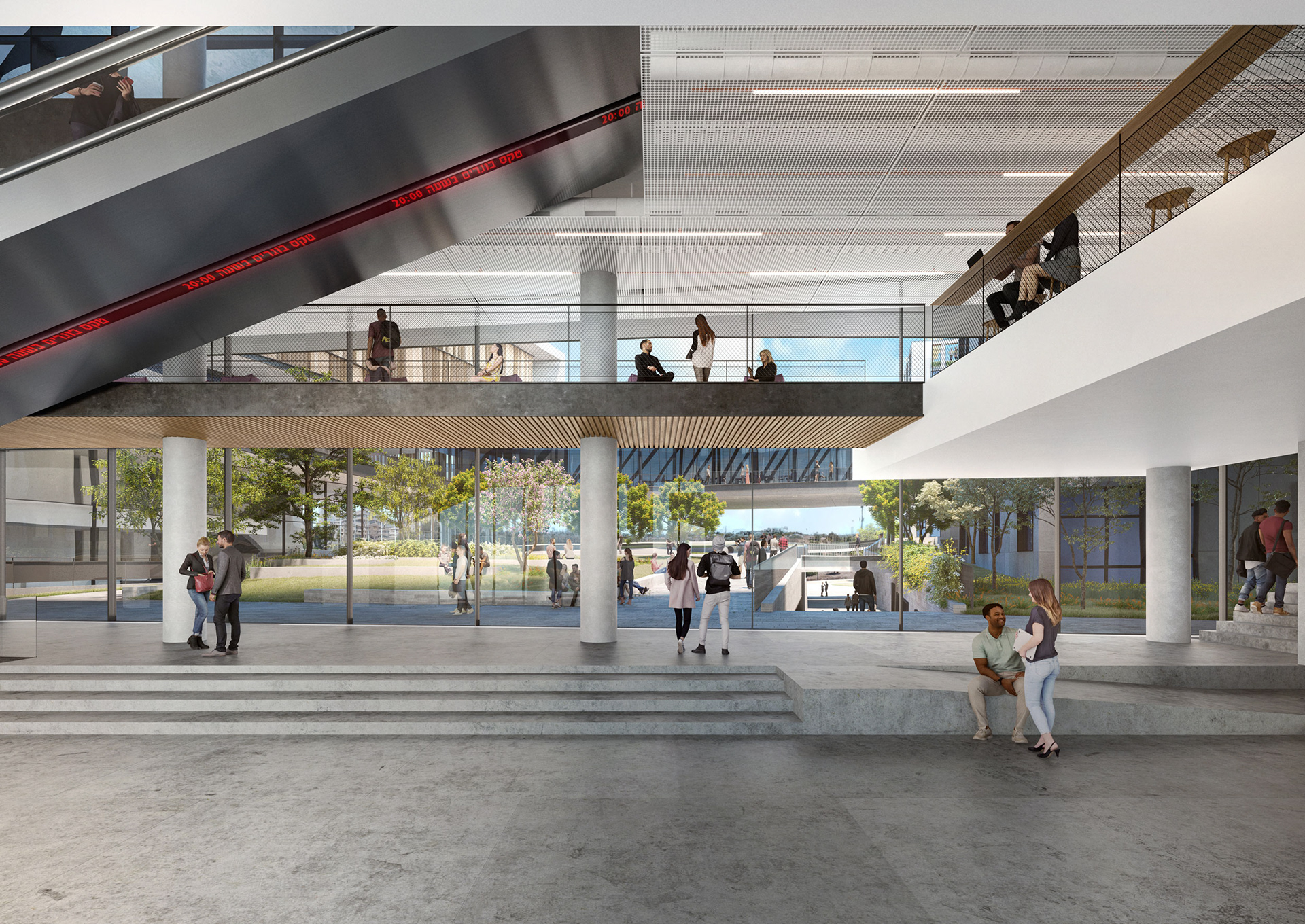 Hovering above ground, the innovation center serves as the heart of the college, connecting its various buildings.